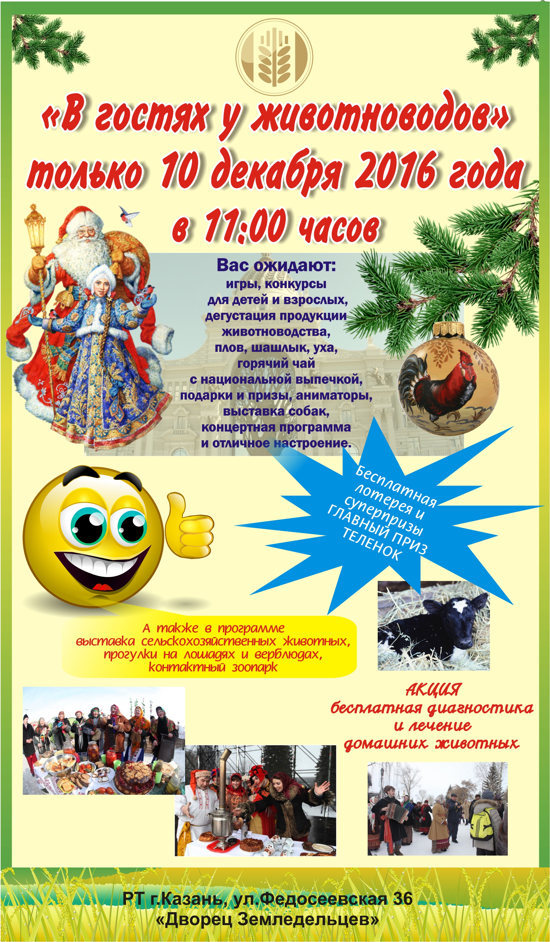 Министерство сельского хозяйства и продовольствия Республики Татарстан в субботу 10 декабря проводит мероприятие, посвященный Дню животновода. В программу праздника войдут выставка сельскохозяйственных животных, прогулки на лошадях и верблюдах. Для гостей мероприятия будет работать контактный зоопарк с экзотическими животными, которых можно будет не только погладить и покормить, но и сделать с ними памятные фотографии. Праздничное настроение мероприятию создадут и игры, конкурсы для детей и взрослых, аниматоры, концерт с известными татарскими исполнителями, а также розыгрыш лотереи. Главный приз – теленок!